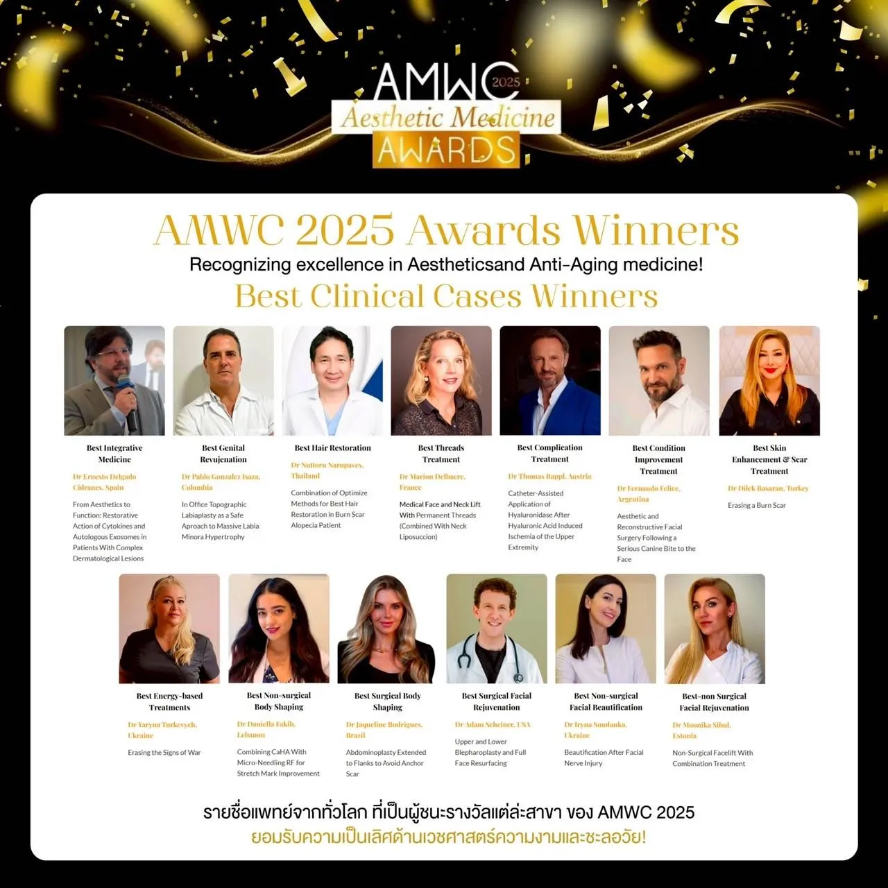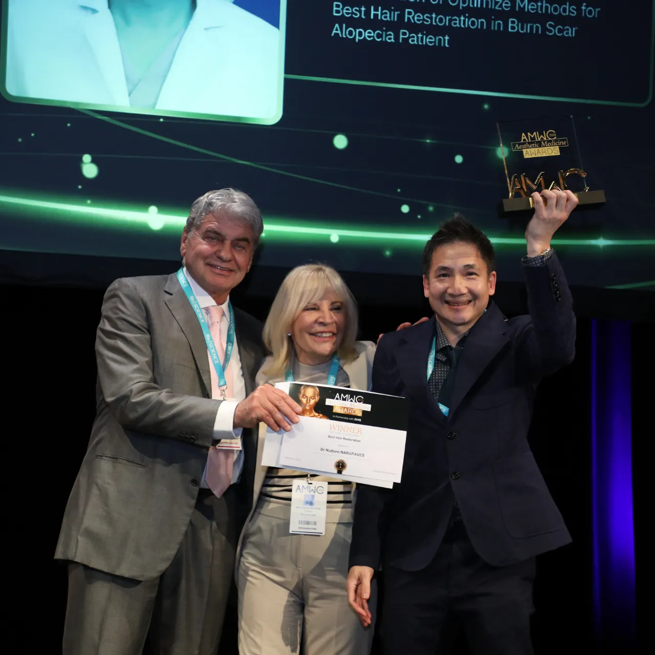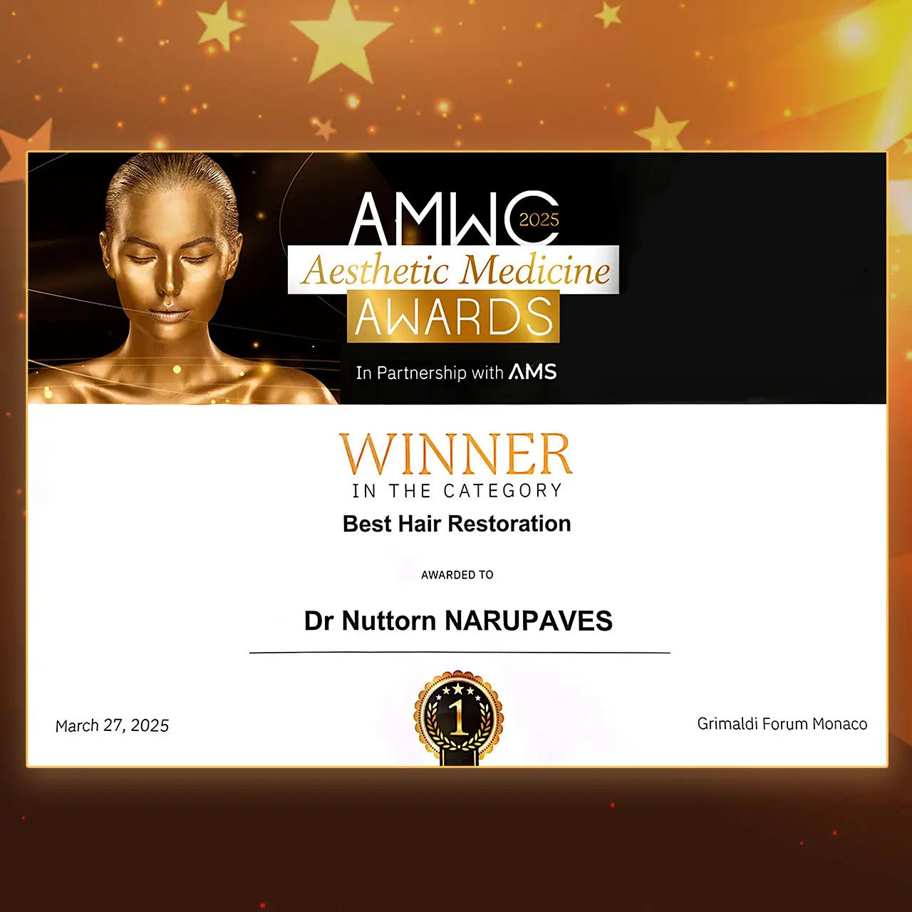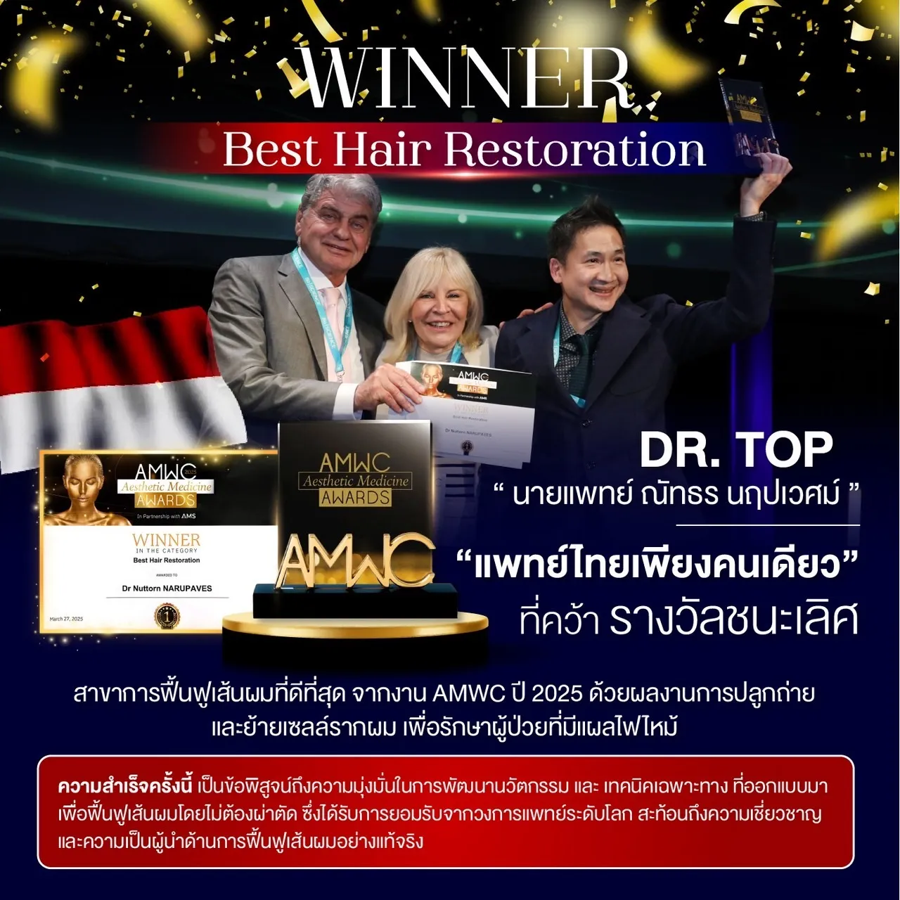 ได้รับรางวัลชนะเลิศ BEST HAIR RESTORATION งานประชุมระดับนานาชาติ Aesthetic & Anti-Aging Medicine World Congress (AMWC 2025) ณ ราชรัฐโมนาโก