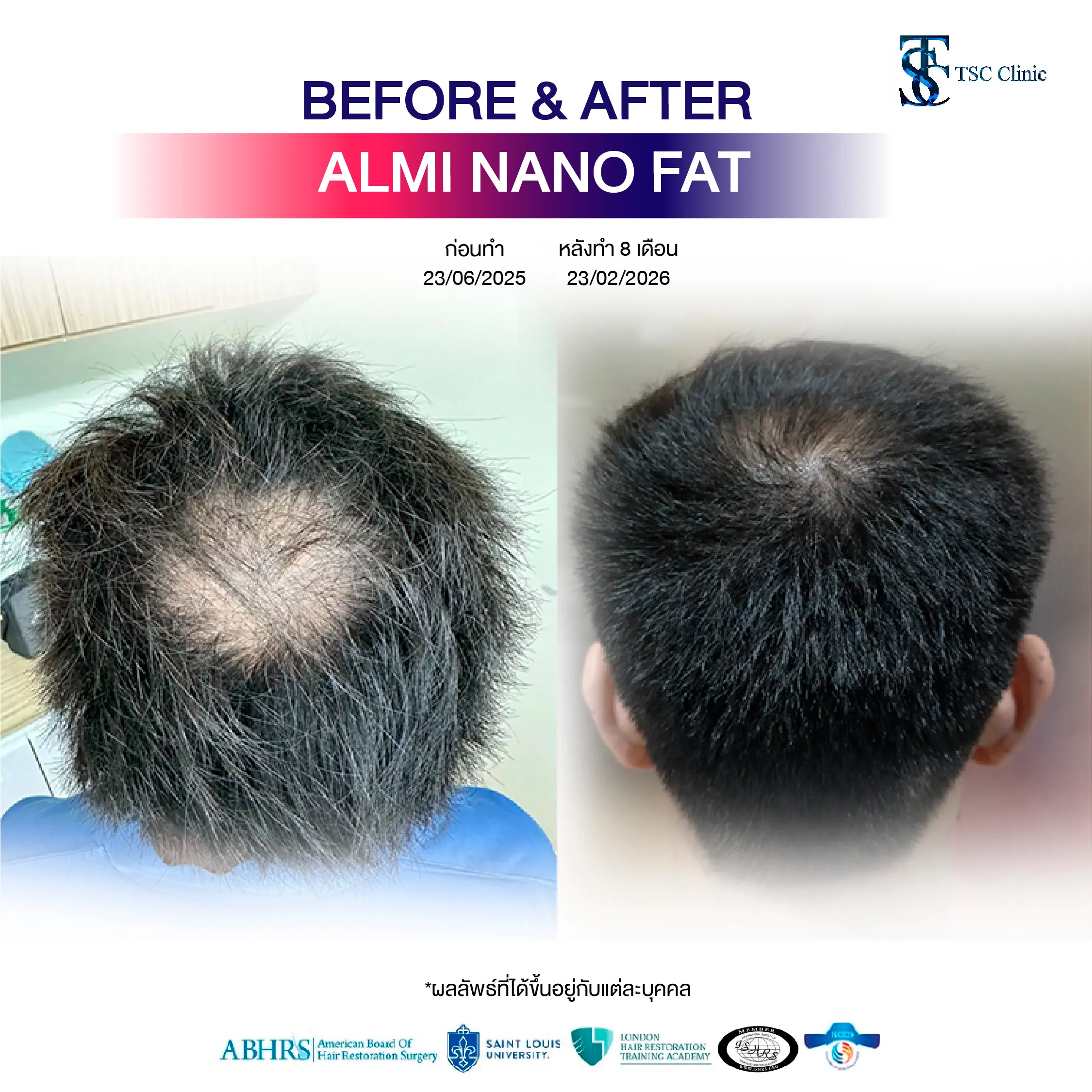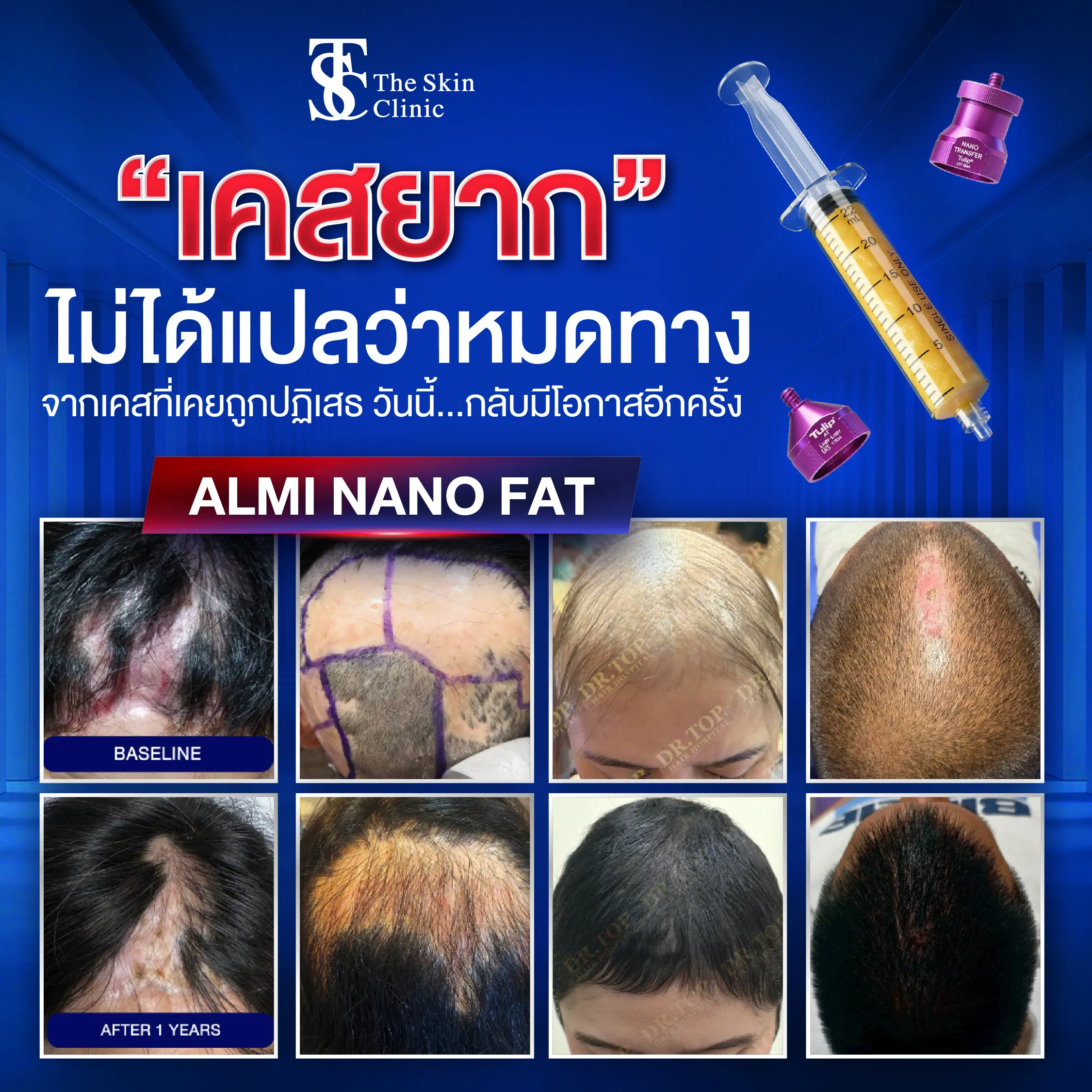 เราจึงเน้นการรักษาแบบ Combination Technique ที่ผสานการปลูกผมเข้ากับการฟื้นฟูหนังศีรษะ เช่น ALMI Nanofat เพื่อปรับสภาพหนังศีรษะ สำหรับการเจริญเติบโตของเส้นผม เทคนิคเฉพาะที่ TSC Clinic นับว่าเป็นมาตรฐานใหม่ของการรักษา (New Standard) ที่ให้ความสำคัญทั้ง “การปลูก” และ “การฟื้นฟู” ไปพร้อมกัน